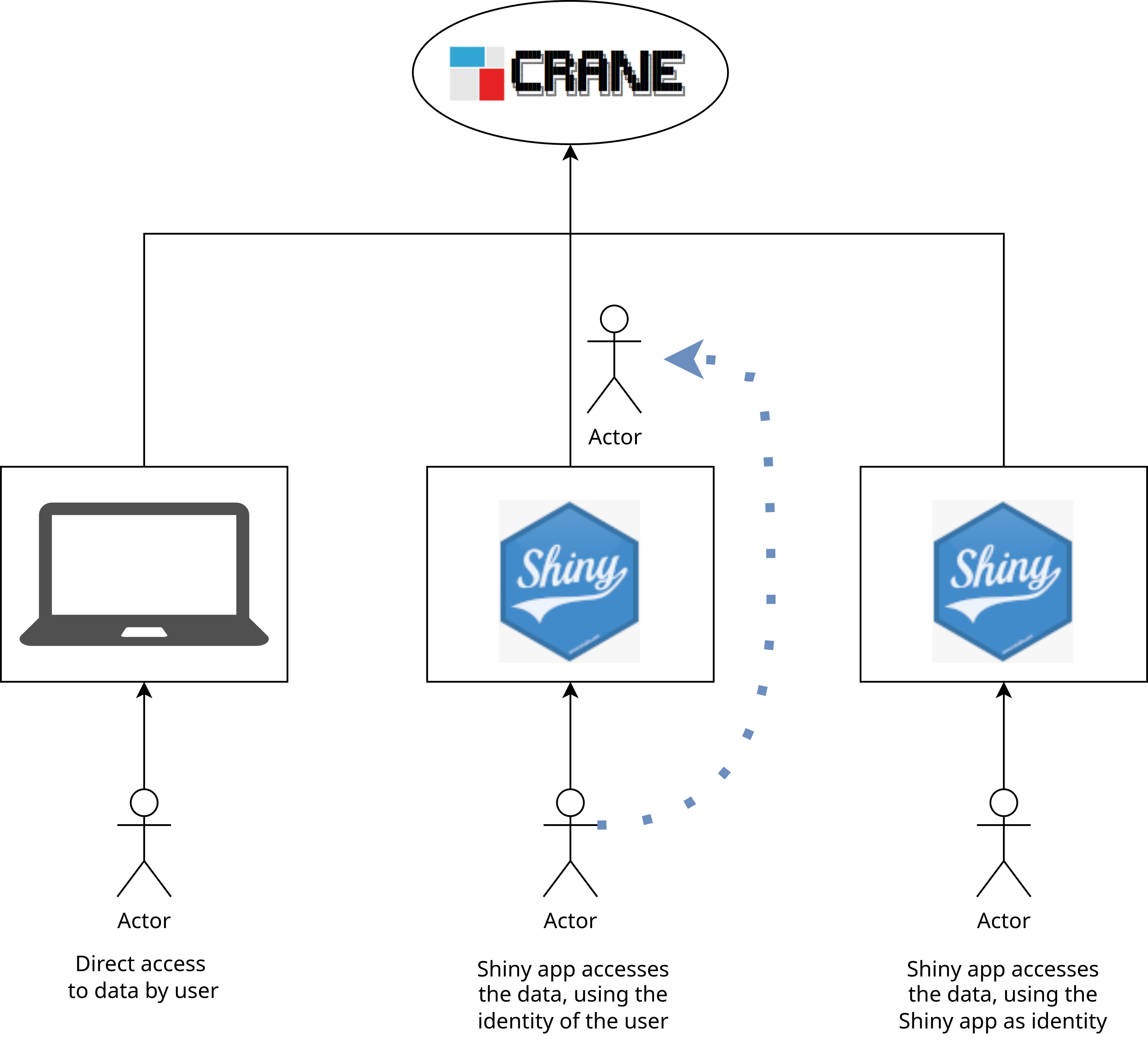 As a data science storage solution, Crane stores all your data and only allows access by authorized users. The data can be accessed using the web UI or HTTP API, allowing users to directly browse and download the data. In addition, the data can be accessed by data science application as well. For example, in order to store the underlying data for a Shiny application. Usually, the Shiny app has direct access to all the data (for that specific app). However, sometimes different users can only access certain datasets, in this case, the Shiny app can use the identity of the user to download the data from Crane. This ensures that authorization to the data is verified by Crane (instead of the Shiny app).